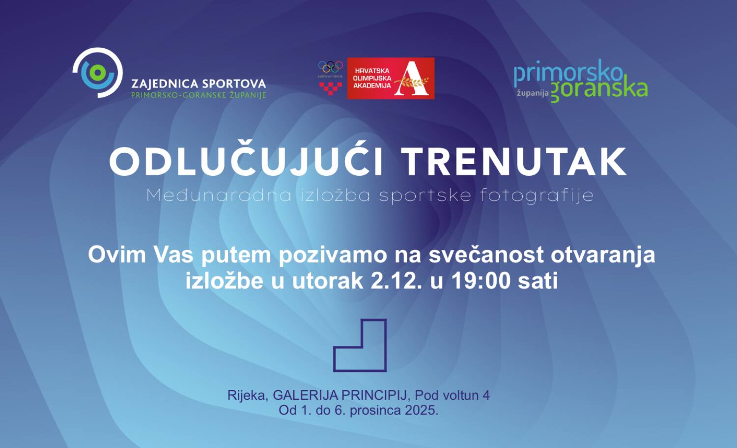 Pozivamo Vas na svečanost otvaranja izložbe sportske fotografije "Odlučujući trenutak - 2025." koja će se održati u utorak 2. prosinca 2025. s početkom u 19:00 sati u Galeriji Principij, Pod voltun 4, Rijeka.