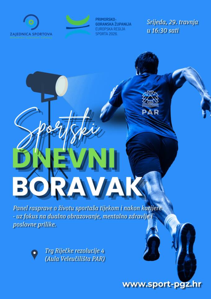 Zajednica sportova Primorsko-goranske županije poziva vas na panel raspravu pod nazivom „Sportski dnevni boravak“, koje će se održati u srijedu, 29. travnja u 16:30 sati na Veleučilištu PAR u Rijeci.