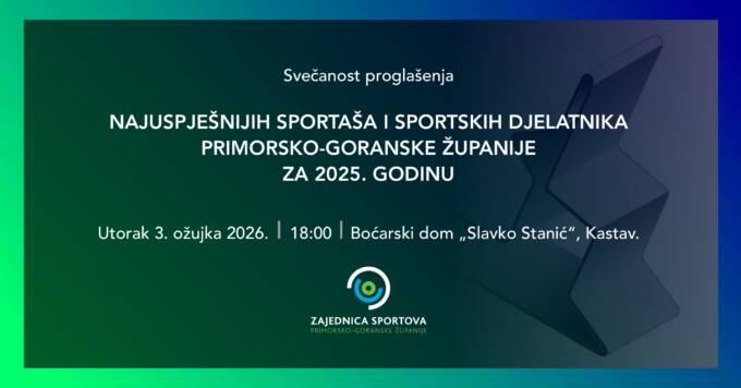 U utorak 3. ožujka 2026. godine, s početkom u 18.00 sati u Boćarskom domu "Slavko Stanić" u Kastvu, održat će se svečanost proglašenja najuspješnijih sportaša i sportskih djelatnika Primorsko-goranske županije za 2025. godinu po izboru Zajednice sportova PGŽ.